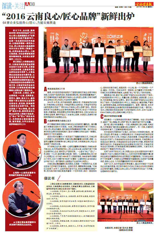 昨日下午,由云南信息报、滇商杂志、云南省民营企业家协会、云南省食品协会等6家机构发起的“2016良心/匠心品牌揭晓仪式”在翠湖宾馆多功能厅隆重举行。这是一场名副其实的年终盛会:云南经济领域一群用良心兴业、匠心筑业的云南品牌和有共识的云南商人聚集在一起,共同弘扬良心/匠心,力挺云南质造,为社会奉献物质财富和精神财富,为实现云南梦竭尽一己之力。