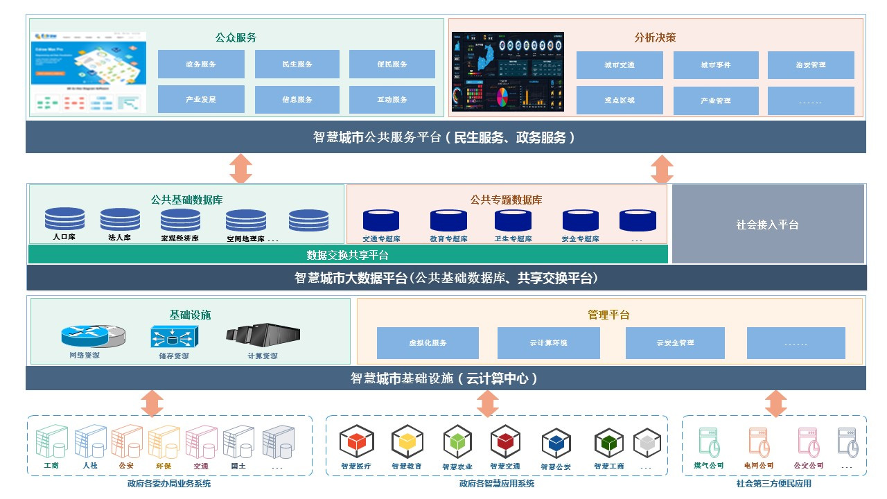 依托互联网、云计算、大数据、物联网、空间地理信息等现代科技和信息化手段,强化信息资源跨界融合运用,大力推进跨部门、跨系统、跨行业的数字资源利用,汇聚政务、企业、个人、感知等数据及资源,及时感测、收集、分析和运用城市及产业信息,解决交通拥堵、预警滞后、环境污染、资源分配失衡、人口膨胀、城市脆弱等一系列“城市病”;通过数据治理形成城市人口、法人、宏观经济、地理空间等基础数据库和各行业专项数据库,达到城市数据纵向清晰、横向关联,深度分析与挖掘城市数据,为民生应用、企业发展、政府决策提供智慧支撑, 推进城市规划、建设、运行、服务、综合管理、应急处置智能化。