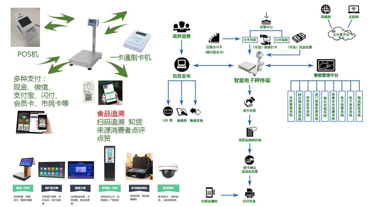 利用物联网、云计算、大数据、人工智能、区块链等信息技术,为市场配备了智慧电子称、商户屏、摄像监控等设备及智慧管理平台,涵盖“市场、商户、物业、经营、场务、数据、设备”各方面管理,实现市场可管控、可感知、可追溯、合同电子化、收费智能化、运营智慧化、数据一体化,极大降低了人工成本。利用AI技术,实现水电、停车、人员、防疫等的智能管理,促进市场有序高效运行,同时大数据实时记录公开透明,产品价格、农残检测、产品溯源、商户证照信息一目了然,交易可追溯,让老百姓的"菜篮子”拎得更舒心、放心、开心。