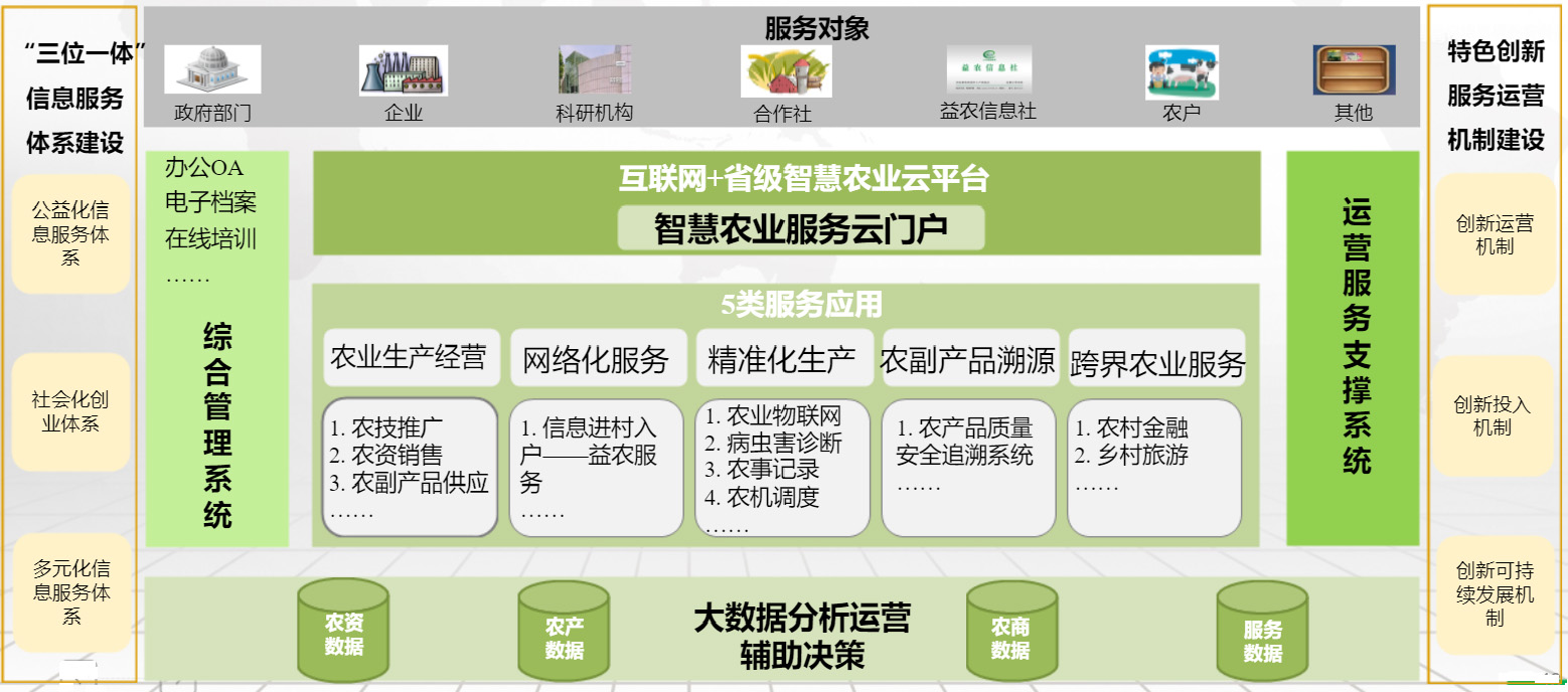 以农业资源为基础、市场为导向、效益为中心、产业化为抓手,面向农业管理部门、农技推广部门、农业企业、农业园区/基地、农业专家、农民等多层次用户体系,充分利用计算机与网络技术、物联网技术、音视频技术、无线通信技术、大数据技术、云计算及专家智慧与知识,集成传感器、土壤墒情采集站、监控视频头、水肥药一体机、太阳能气象站、太阳能捕虫仪、太阳能电磁阀、智能手机等智能化自动化设备,建设以农产品质量安全、农资安全监管、农业区域资源为主的监管平台,以种植指导、病虫害防治、标准化生产、农业物联网、农业生产诊断决策为主的生产管理平台,以及以农业资讯、农产品价格走势、农产品交易、营销推广、质量溯源、植物医院、农技推广服务、人力资源服务为主的信息服务平台,实现更完备的信息化基础支撑、更集中的数据资源、更深入的政府监管、更先进的生产管理、更贴心的公众服务,实现农业生产、监管、服务一体化支撑,以及农业农村全方位、全过程的信息化、智慧化管理,达到信息技术与产业发展的和谐提升,推动现代农业快速发展。